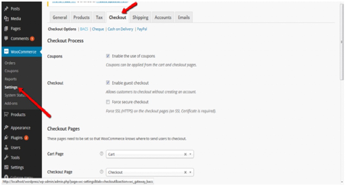 - The first step is to login to the Back-end of your site. Click the settings link under WooCommerce menu.